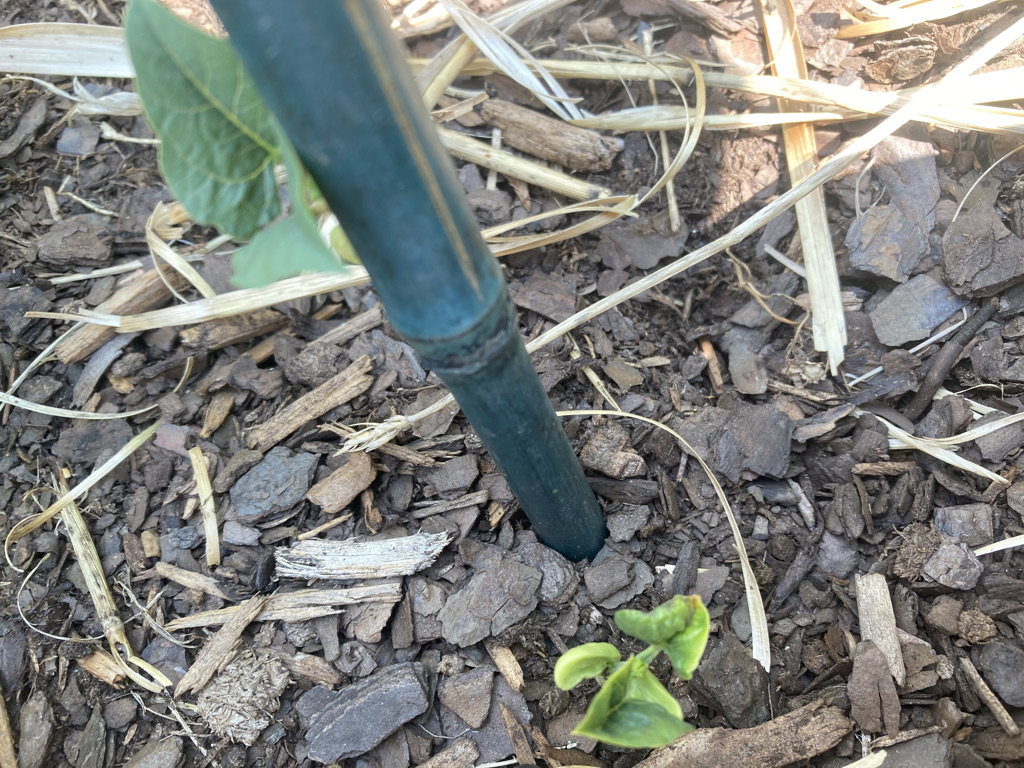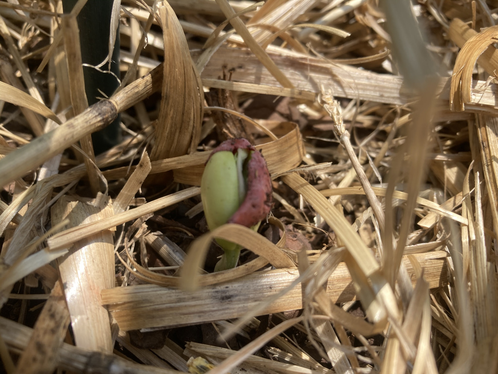 Last week we stopped by the garden store and picked up a packet of dried soup beans. Our first intentionally planted beans in this plot! The packet said 7-10 days to germinate, and here they are.