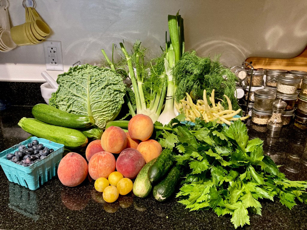 - Purple bell peppers, huh? I think the idea of stuffing them is the right idea. I’m not as big a fan of bell peppers, so I don’t know what to do with them beyond top salads or pizza or stirfy. Especially when we don’t yet have tomatoes. There is the roasted pepper panzanella in Six Seasons that would use some pepper and red onion and some oregano. Which may make it enough of a winner right there.
