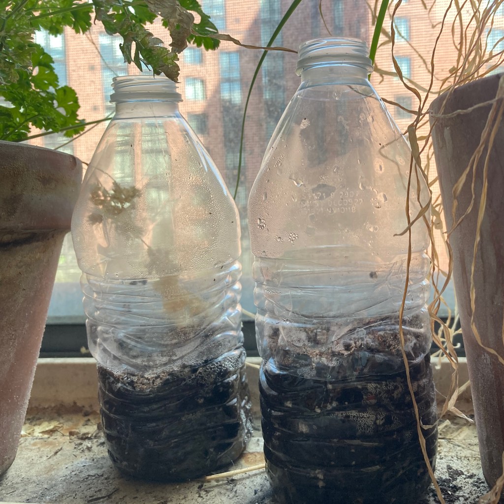 I pulled up the cucumber plant one day. A few days later, you turned the compost and tried to rescue some kale volunteers. Placing them where the cucumber was. I was doubtful on Tuesday. But on Thursday, three of them had a sturdy-ish leaf. Wait, water, and see.